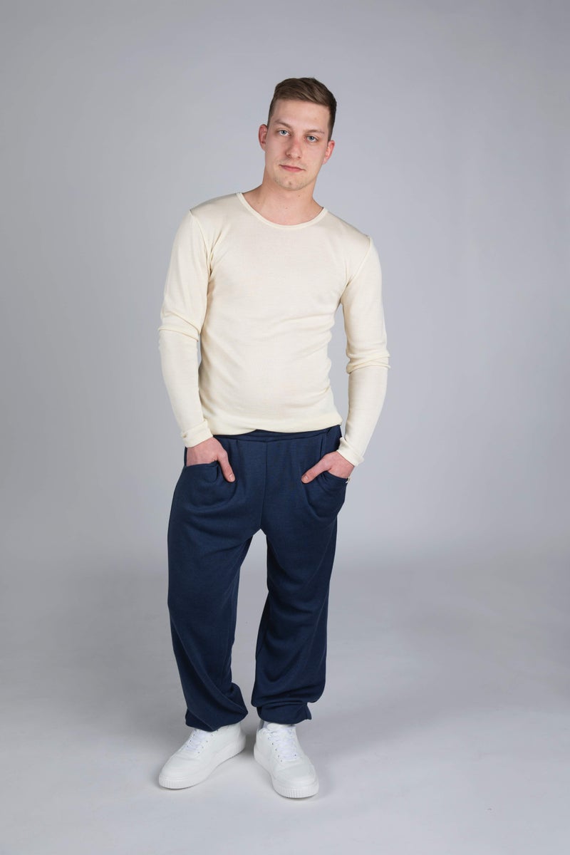 Merinosilkki joggerit sileää interlock-neulosta. Vyötäröllä kuminauhan lisäksi nauhakiristys, sivuilla taskut. Pehmeä resori lahkeensuissa. Koossa M lahkeen sisäpituus 77 cm Vyötärön ympärys venyttämättä 76 cm ja lantion ympärys venyttämättä 108 cm.
